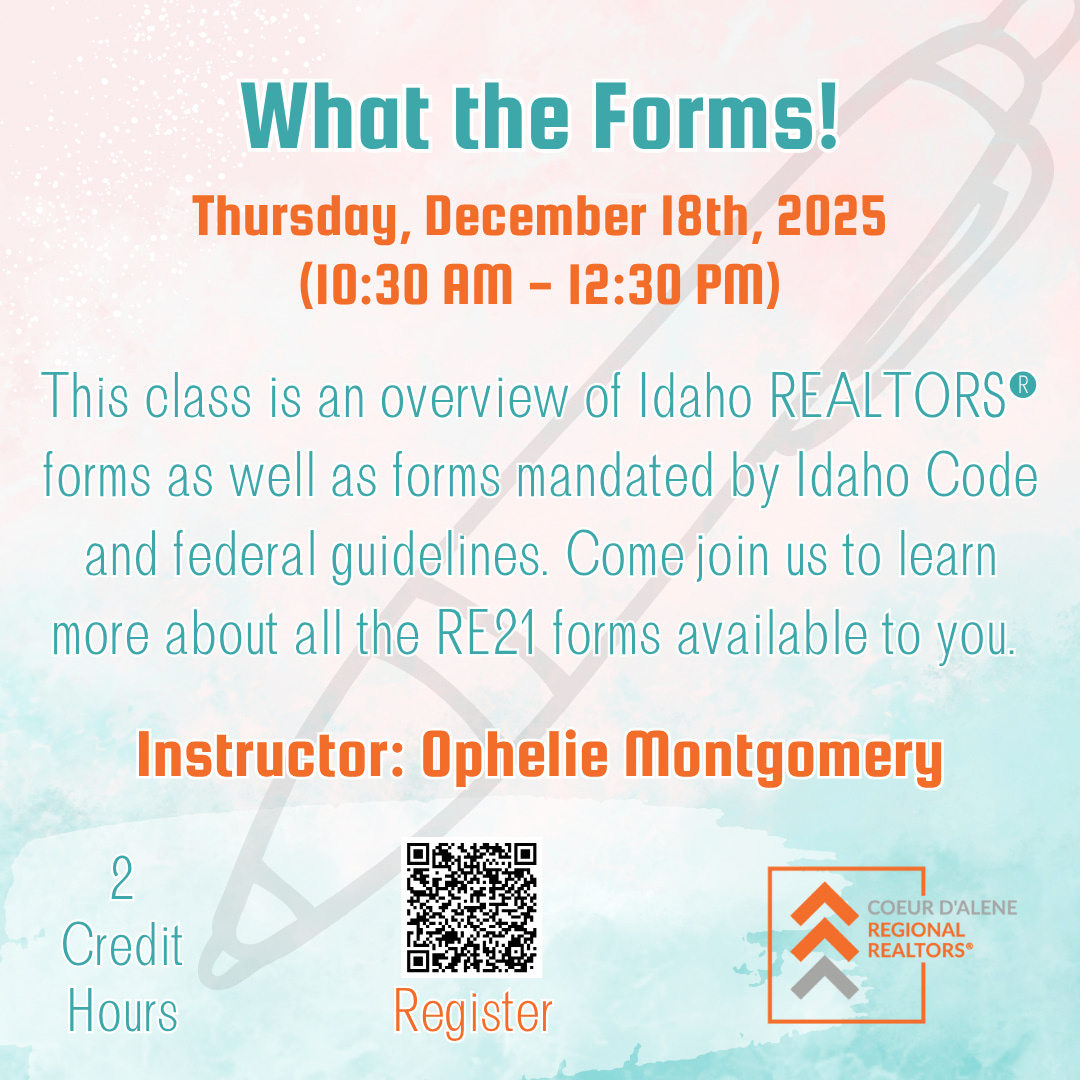 What the Forms! is an overview of Idaho REALTORS forms as well as forms mandated by Idaho Code and federal guidelines. Come join us to learn more about all the RE 21 forms available to you. Course fee: Complimentary to CRR members. Non-members $20.00 Instructor: Ophelie Montgomery