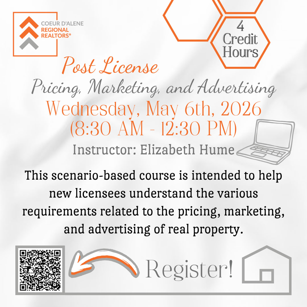 Post License 4 hour module. This scenario based course is intended to help new licensees understand the various requirements related to the pricing, marketing, and advertising of real property.