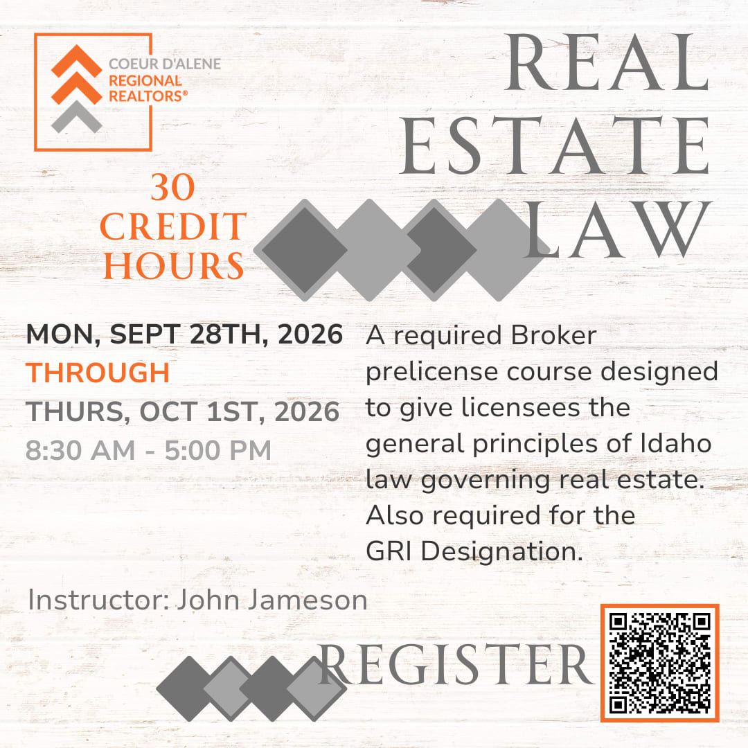 A required Broker prelicense course designed to give licensees the general principles of Idaho law governing real estate. Also required for the GRI Designation. Course fee: CRR members $75, Non-members $100.00 Instructor: John JamesonImages
