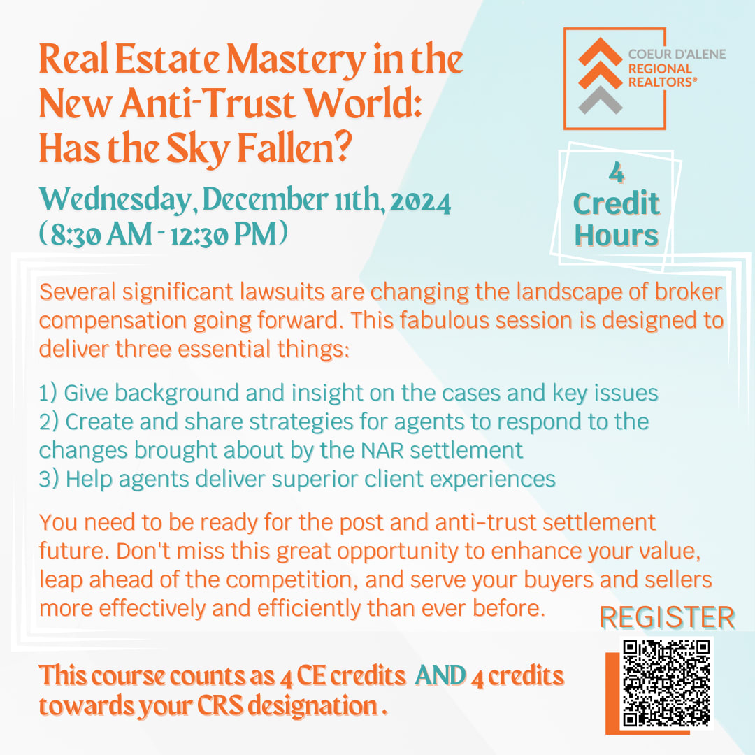 Have you heard of Christopher Moehrl? If you haven't, where have you been? Several significant lawsuits are changing the landscape of Broker compensation going forward. This fabulous session is designed to deliver three essential things: 1) Give background and insight on the cases and key issues, and 2) create and share strategies for agents to respond to the changes brought about by the NAR settlement, and 3) help agents deliver superior client experiences. You need to be ready for the post and anti-trust settlement future. Don't miss this great opportunity to enhance your value, leap ahead of the competition, and serve your Buyers and Sellers more effectively and efficiently than ever before.