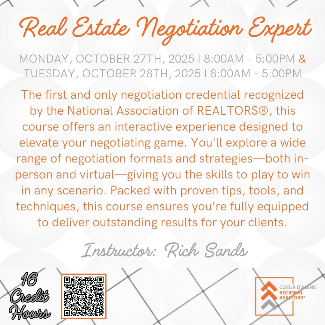The first and only negotiation credential recognized by the National Association of REALTORS®. This course is an interactive experience to help negotiators elevate their game! You will examine all types of negotiation formats and methods -- including virtual -- so that you can play the game to win! A full spectrum of tips, tools, and techniques are provided so that can produce effective results for your client.