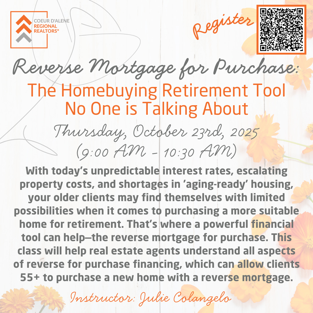 With today's unpredictable interest rates, escalating property costs, and shortages in aging-ready; housing, your older clients may find themselves with limited possibilities when it comes to purchasing a more suitable home for retirement. That's where a powerful financial tool can help - the reverse mortgage for purchase. This class will help real estate agents understand all aspects reverse for purchase financing, which can allow clients aged 55 and older to purchase a new home with a reverse mortgage. Course fee: Complimentary to CRR members. Non-members $25.00 Instructor: Julie ColangeloImages