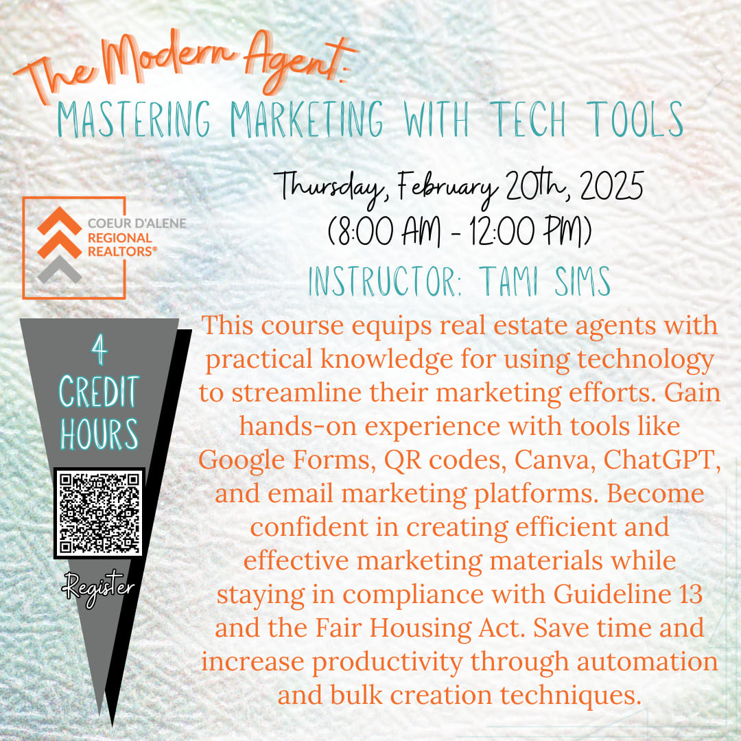 Course Objectives: Equip real estate agents with practical knowledge of using technology to streamline marketing efforts. Provide hands-on experience with tools like Google Forms, QR codes, Canva, ChatGPT, and email marketing platforms. Enhance agents’ ability to create efficient and effective marketing materials while staying in compliance with Guideline 13 and the Fairhousing Act. Save time and increase productivity through automation and bulk creation techniques.