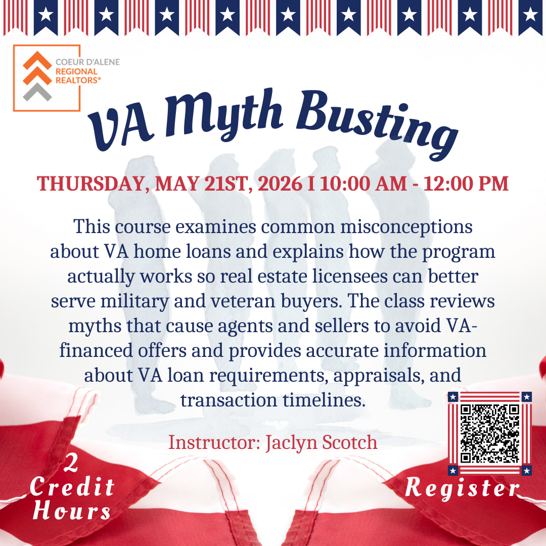 This course examines common misconceptions about VA home loans and explains how the program actually works so real estate licensees can better serve military and veteran buyers. The class reviews myths that cause agents and sellers to avoid VA-financed offers and provides accurate information about VA loan requirements, appraisals, and transaction timelines.