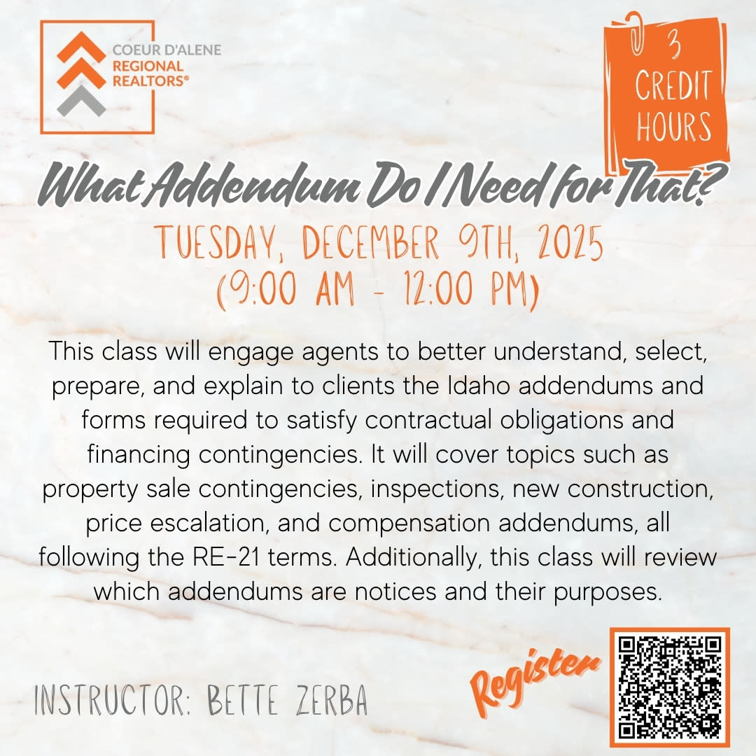 This course will engage Agents to better understand, select, prepare, and explain to clients the Idaho Addendums and Forms required to satisfy contractual obligations and financing contingencies, prior to showing, property sale contingencies, inspections, new construction, price escalation, and compensation addendums following the RE-21 terms. This course will review which addendums are notices and their purposes.